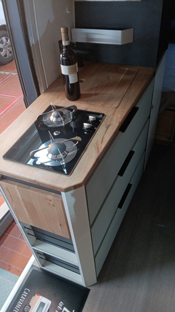- Küchenplatte nach Maß: die Küchenplatte des Campers wurde nach den individuellen Wünschen des Kunden geplant und passgenau umgesetzt. Ein maßgeschneidertes Upgrade für persönlichen Komfort und Bequemlichkeit.
